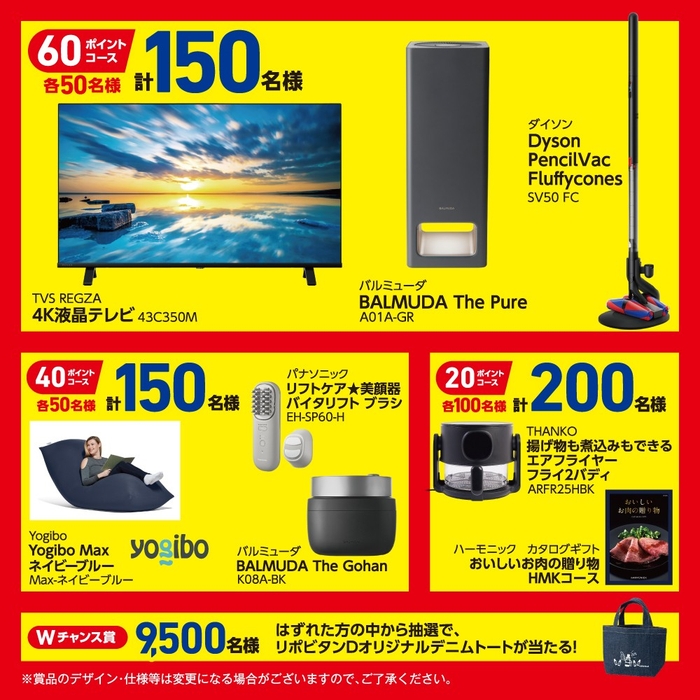 対象製品についている応募シールを集めて、応募期間中に専用はがき、またはWebサイトから応募いただくと、ポイント数に応じて、抽選で豪華家電製品や毎日の生活が豊かになるアイテムなど、素敵な賞品が抽選で合計10,000名様※1に当たります。