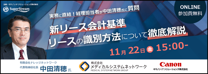 セミナー第1部では、適用指針に記載されている「リースの識別に関するフローチャート」をはじめ、会計基準の要点について中田清穂 氏に解説いただきます。第2部では、リース契約の判断基準やリース期間の判定について専門的な見解を得るため、財務会計/人事給与システム「SuperStream-NX」のユーザーである株式会社メディカルシステムネットワークから経理担当者をお招きし、中田清穂 氏に実際の契約内容をもとにリース契約に関する現場の疑問について回答していただきます。
