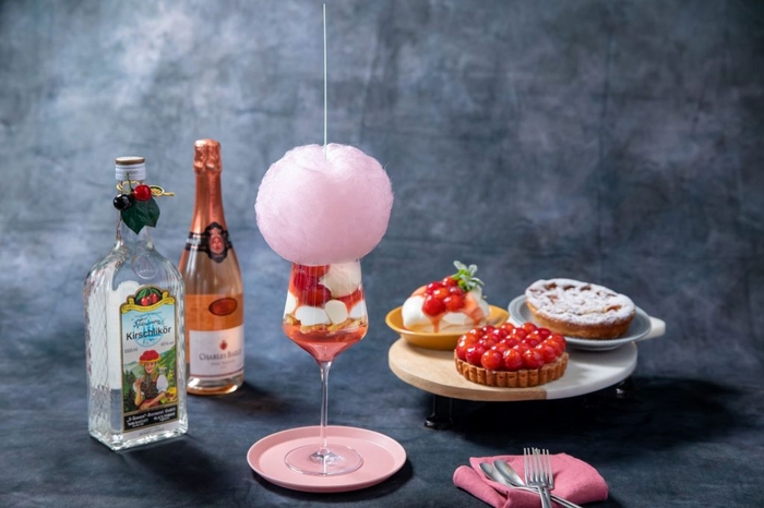 完熟さくらんぼパフェは、発酵させたさくらんぼの果汁から造られる蒸留酒「キルシュ」を混ぜ込んだ「キルシュクリーム」や、ブランデーシロップで風味をつけたクッキーを使用しており、大人におすすめのパフェです。北海道ではお酒を飲んだあとにパフェを食べる「〆パフェ」文化があり、食事の〆に合うよう仕上げました。さくらんぼがごろっと入ったソースを使用しており、さくらんぼタルトをイメージしてつくりました。さくらんぼのような淡いピンク色のコットンキャンディーが、思わず写真を撮ってしまいたくなる可愛らしさです。