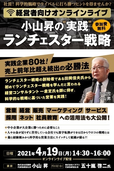 株式会社武蔵野(東京都小金井市、代表取締役社長:小山昇、以下武蔵野)は、4月19日14:30より、『小山昇の“実践”ランチェスター戦略』と題しまして、経営者向け無料オンラインライブ配信を行うことを決定いたしました。