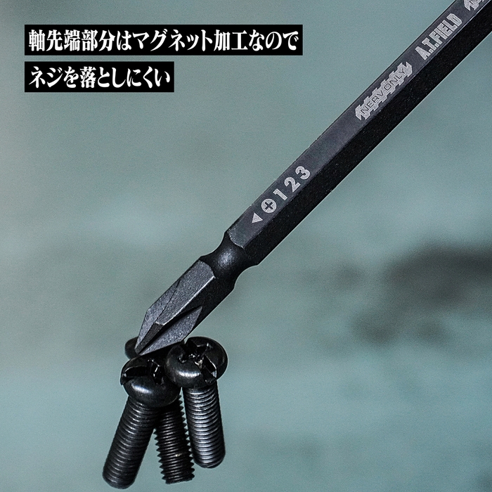 グリップ表側には「A.T.FIELD」の表記。NERV官給のタフなツールブランドを表現しています。裏側には「NERV本部」「技1備品」などを表記し、NERV技術開発部技術局第1課の備品をイメージさせるミリタリーな印象です。軸部分はマットなブラック仕様でタフな印象に仕上げつつ、レーザーマーキングによって対応ネジサイズや注意事項が精密に刻印されています。作品の世界観と機能性を融合したデザインです。