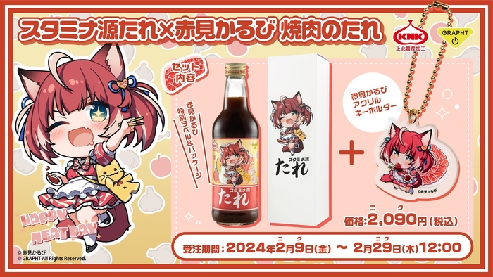 今回の2月9日(にくのひ)“スタミナ源たれ”×赤見かるび特別コラボは、コラボ特別仕様の焼肉のたれとパッケージに、アクリルキーホルダーがセットになっています。