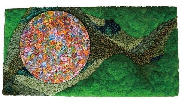 この作品は、アントロポセンという人間活動が地球環境に顕著な影響を与えている現代において、絶滅した種を復活させる試みにインスピレーションを得ています。ハーバード大学をはじめとする研究機関で進行しているディエクスティンクションプロジェクト、つまり絶滅種の復活研究をテーマに取り上げ、新しい自然の風景を創造しています。円形の作品は、時間の連続性と自然の永続的なサイクルを表現しており、「不生不滅」の哲学を象徴的に描いています。プリザーブドフラワーを用いることで、絶滅した生命が再び色鮮やかに息吹を取り戻す様子を表し、永続性と新たな命の創造への希望を伝えます。また、七宝や京薩摩などの日本の伝統工芸技法が加わることで、作品は時間を超えた文化的対話を織りなし、絶滅と復活というテーマを深く反映した、豊かなテクスチャと多層的な意味合いを持つアートとなっています。