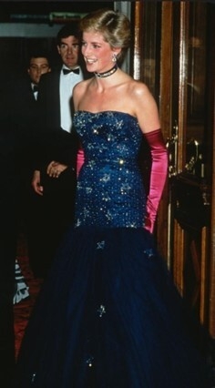 ダイアナ妃が1986年に2度、「オペラ座の怪人」のプレミアとギリシャ国王コンスタンティンのためにクラリッジで行われた晩餐会で着用した、ボディーにフィットしたマレー・アーベイドのミッドナイトブルーのストラップレス・チュール・ディアマンテ・スター・ガウン(ドレス)。このドレスは彼女の着用画像が数多く残っている、グラマラスなドレスです。ダイアナ妃はまた、1997年に自身のチャリティオークションで、このドレスを着てスノードン卿に撮影されました。