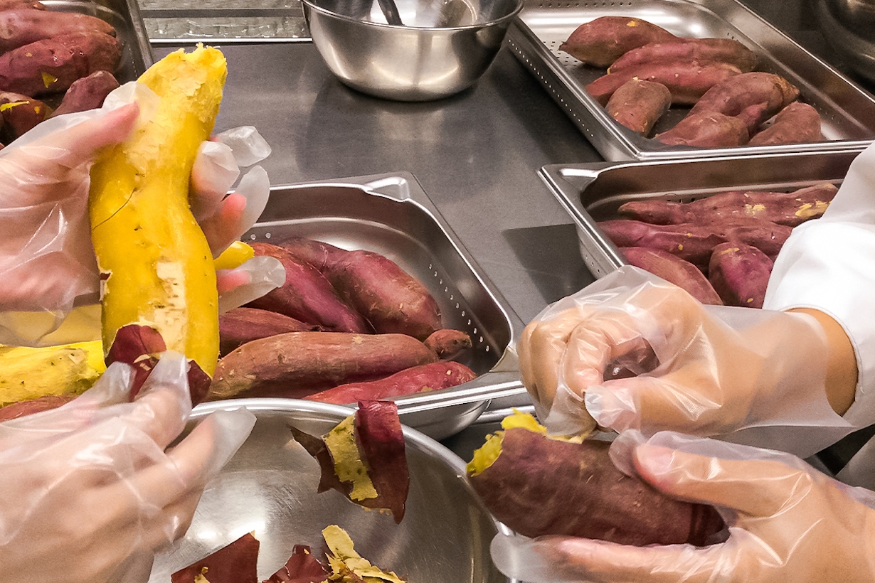 日本のさつまいも輸出シェア36%超え(※)を誇る、宮崎県のくしまアオイファーム様のさつまいもを使用。おいもペーストは、ホカホカの焼き芋を剥くところから、裏ごし、混ぜるところなどすべて、手作業で作っています。(※2021年11月時点)