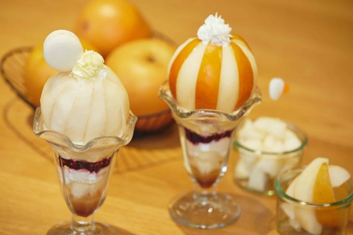 ホテルへ持ち帰ってきた梨をまるごと使用して「梨まるごとパフェ」を作ることができます。トッピングや器をパブリックスペース「TAMARIBA(タマリバ)」で受け取り、梨と一緒にバニラアイスやホイップクリーム、ジャム、チョコレートクランチといったトッピングを自由に盛り付けたら完成!旬の梨を存分に楽しめます。