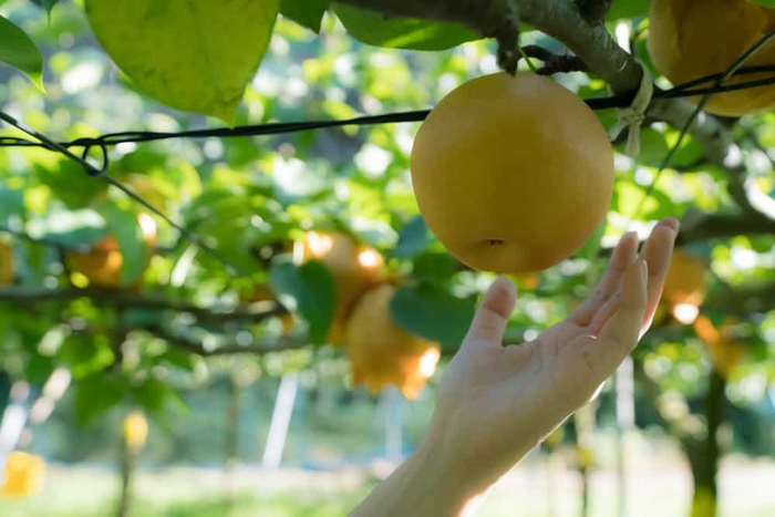 サイクリングの後には、梨狩りを体験できます。梨を収穫するのは、土浦から自転車で片道10km(約1時間)、土浦市の北東部に隣接している梨の産地、かすみがうら市にある「福田グリーン農園」です。農園で1時間、梨を味わうことができます。また収穫した梨は、トレーラー付きの自転車に積んでホテルへ持ち帰ることができます。
