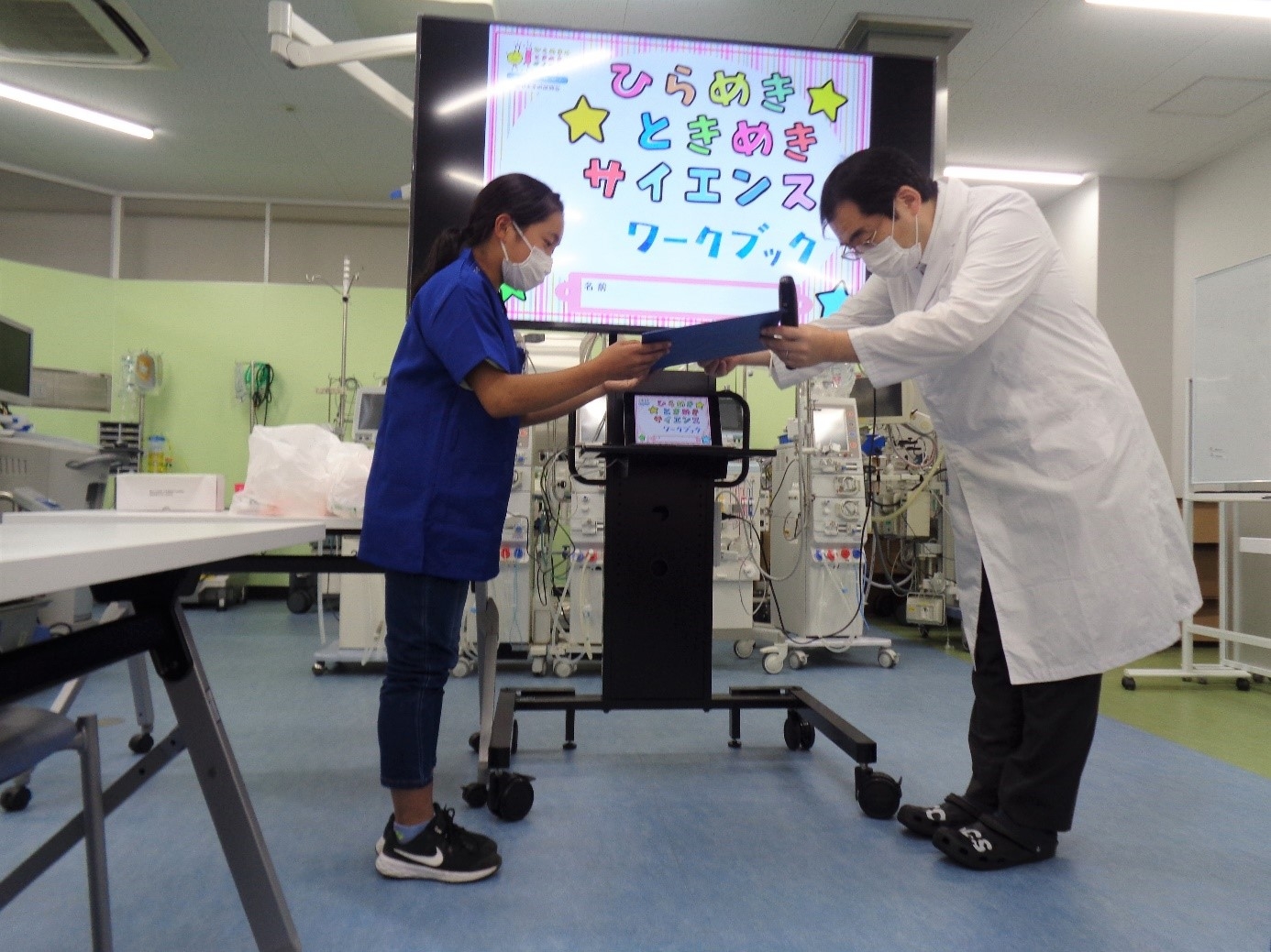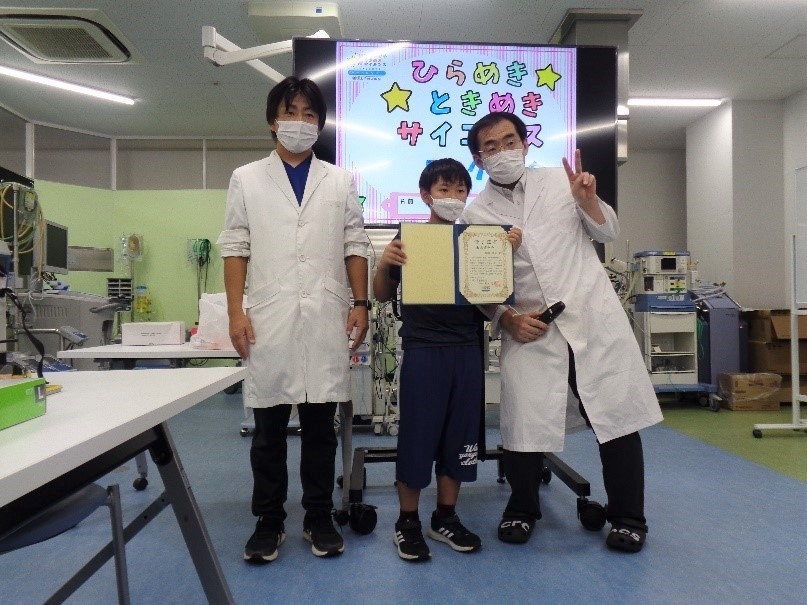 プログラムの最後には修了式が行われ、前川佳敬副学長より参加者一人ひとりに「未来博士号」を授与しました。アンケートでは、「ろかの実験がいちばんおもしろかったです。(参加者/小学校5年生)」、「腎臓の解剖や人工腎臓を使った実験など、学校では体験出来ないことが出来て、貴重な時を過ごせたことに感謝しています。子どもが将来のことを考えるひとつのきっかけにもなったと思います(保護者)」等の感想がありました。