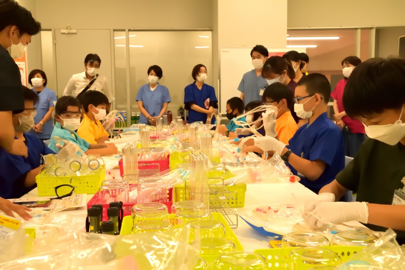 今回のプログラムでは、小学5・6年生を対象に、医療技術学部 臨床工学科 辻義弘准教授が「『おしっこ』ってどうやって作られるんだろう?人工腎臓で学ぶ腎臓の不思議な働き」をテーマに講義や実験等を企画し、10名の小学5・6年生とその保護者が参加しました。また、実施協力者として、臨床工学科の学生6名、本学臨床工学科卒業生2名が参加しました。