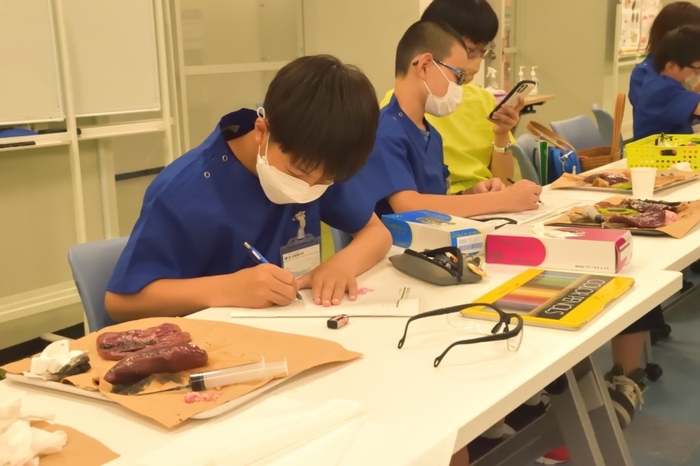 腎臓の解剖実験では、はじめは本物の腎臓(豚)を見て驚いている参加者もいましたが、説明をしっかり聞きながら真剣に腎臓の構造を観察している様子が見られました。次に、実際に医療現場で使用されている「人工腎臓」と「血液透析用監視装置」を使用し、ジュースや牛乳等をろ過する実験を行いました。ジュースや牛乳の変化から、腎臓の働きを学び、人工腎臓の仕組みについて学習しました。