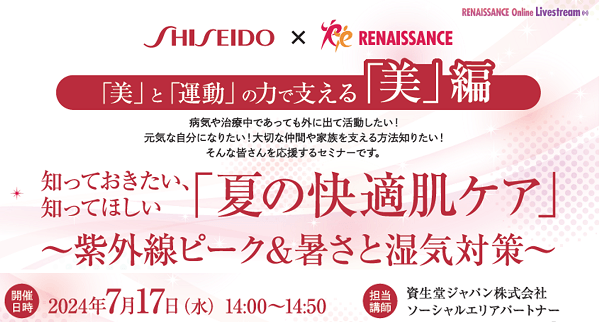株式会社ルネサンス(本社:東京都墨田区、代表取締役社長執行役員:岡本 利治、以下「当社」)は、この度、当社が取り組む「がん患者のQOLを高めるためのがん患者支援」の一環として、資生堂ジャパン株式会社(以下「資生堂」)が実施する「資生堂ライフクオリティー ビューティー活動」と連携し、紫外線ケアに関する「夏の快適肌ケアセミナー」を共催します。