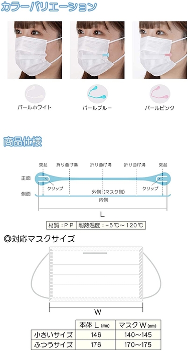 今回、お客様からのご意見・ご要望を参考にした改良を行い、クリップ部分の形状を変更する事で、従来品よりもしっかりマスクに装着する事が出来るほか、パッケージも一新されました。