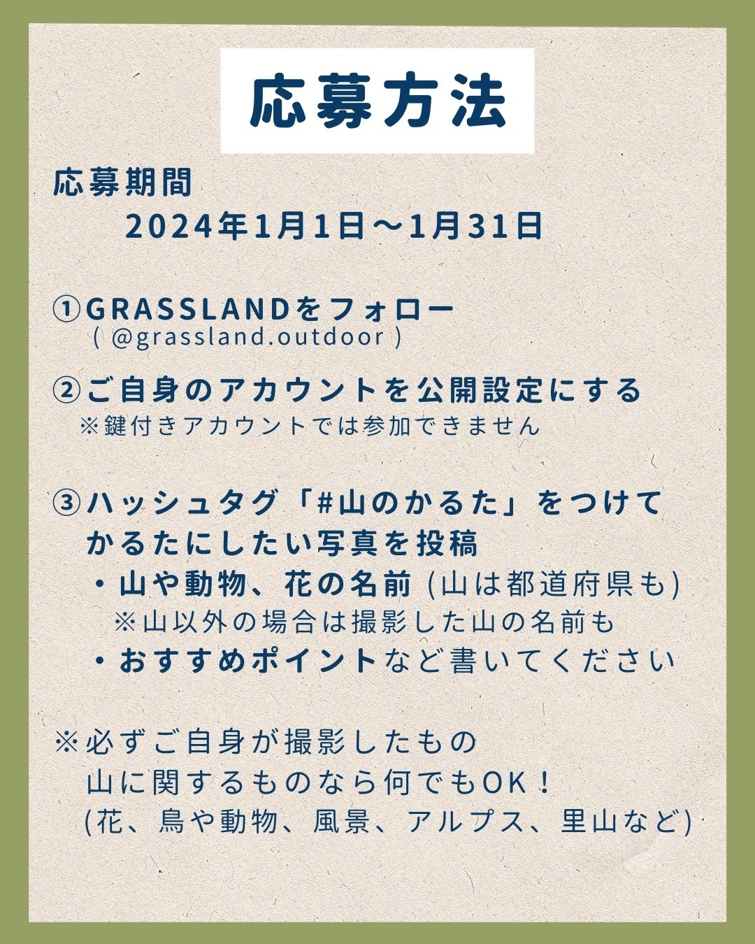 応募方法:Instagramアカウント「@grassland.outdoor」をフォローし、
