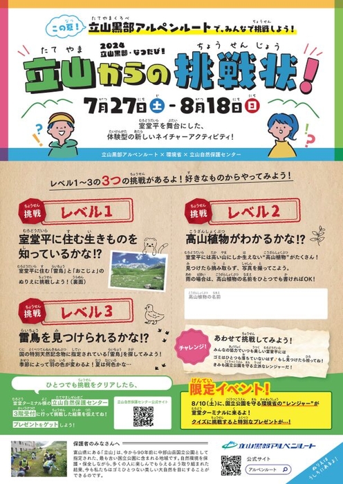 挑戦状に書かれた3つの挑戦に取り組むと、室堂平に生息する生きものや高山植物だけでなく、国立公園で長年行われてきた自然保護・保全活動についても学ぶことができます。さらに、参加者が取り組んだ作品(ぬりえ)は富山駅前商業施設マルート内で展示し、立山の大自然を未来に繋ぐ一員として紹介されます。