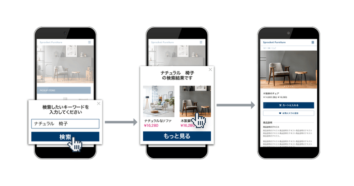 通常、サイト内検索はユーザーが主体的にメニューを選択し、サイト内検索ページに遷移してから文字を入力するのが一般的です。ZETA SEARCHとSprocketが連携することで、ユーザーの行動にもとづいて最適な検索機能をポップアップ内で提供可能になります。シナリオ次第で、文字を入力することなく、カテゴリーを選択するだけでZETA SEARCHの高度なサイト内検索機能を活用することも可能です。