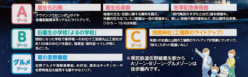 葛生化石館、吉澤記念美術館、よるの学校、もてなし家赤部