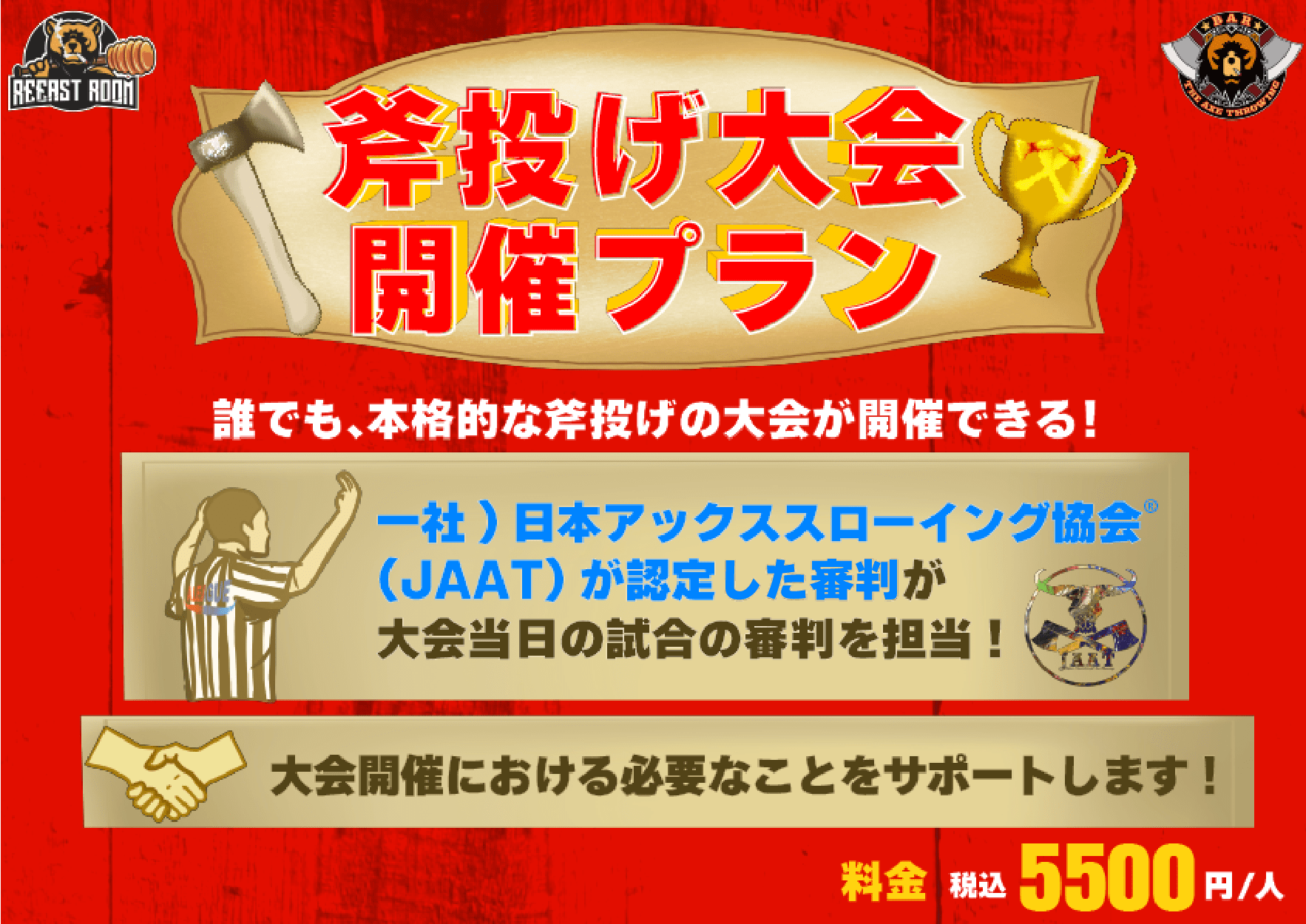 「斧投げ大会開催プラン」とは、誰でも簡単に本格的なAXE THROWING(斧投げ)の大会が開催できるプランとなります。