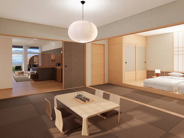 洋室リビングと和洋室の寝室を備えたオーシャンビューのスイートルーム。寝室はベッドルームと和室を仕切ることが出来るのでグループ旅にもおすすめの間取り。22㎡のテラスには専用のバレルサウナと露天風呂、整い椅子を設置しています。