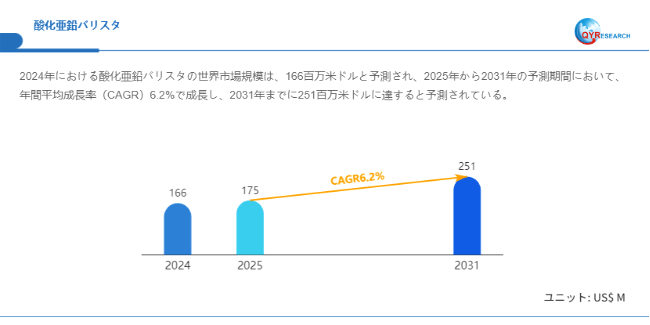 QYResearchが発表した新たな市場調査レポート「酸化亜鉛バリスタ―グローバル市場シェアとランキング、全体の売上と需要予測、2026~2032」によると、世界の酸化亜鉛バリスタ市場規模は2024年の約166百万米ドルから2025年の175百万米ドルへと順調に拡大すると見込まれ、予測期間中は年平均成長率(CAGR)6.2%で成長し、2031年には251百万米ドルに達すると予測されている。