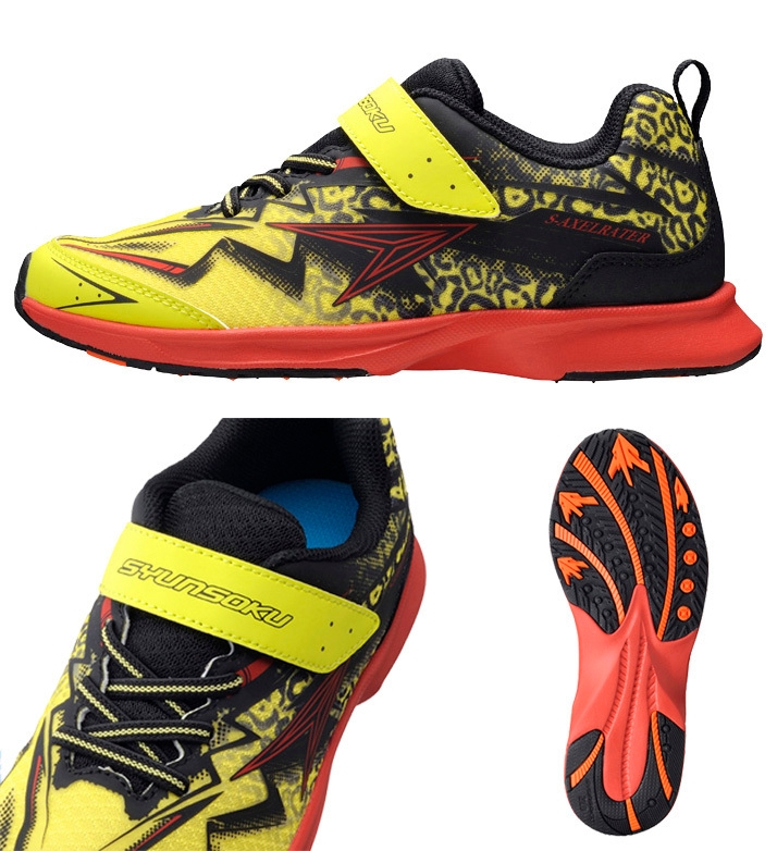 「S-AXELRATER」は、陸の最速動物「チーター」をデザインモチーフに開発。アッパーの一部に「チーター」柄を取り入れインパクトあるデザインに仕上げています。また、コーナー走行時にしっかりと地面を捉えるようアウトソールを段階的に傾斜させた独自の設計「DIGIGRIP(デジグリップ)」や令和の子どもの足に合わせてフィッティング性を向上させたラスト設計「NEO-RACING FIT LAST(ネオ-レーシングフィットラスト)」を採用しており、子どもたちの走りをサポートします。