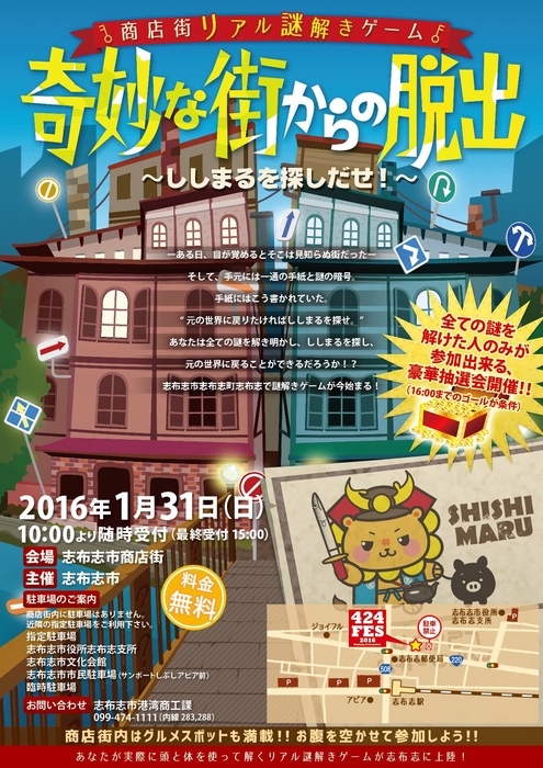 当日は鹿児島県志布志市が主催する音楽フェスに来る人に志布志の街を回遊してもらいたいという希望があり、今回の商店街周遊型の謎解きを開催しました。
