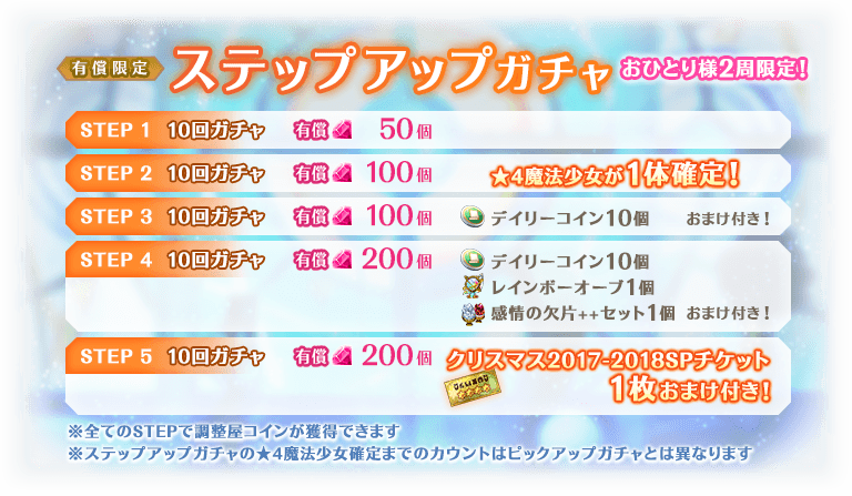 ※STEP5、STEP7での★4魔法少女について、ピックアップ対象の魔法少女が確定するわけではございません。