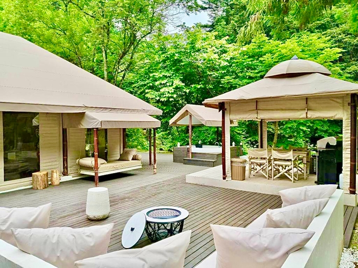 広いウッドデッキにおしゃれなテント。秋川渓谷の大自然の中、BBQや焚き火などが楽しめる『FUREAI GLAMPING&BBQ』