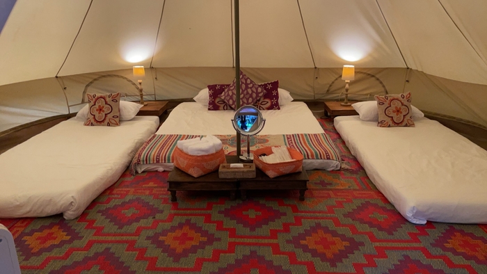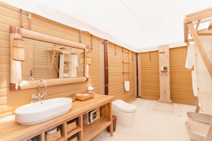 南国のリゾートを彷彿とさせるラタンの家具に、女子の憧れ「天蓋付き」キングサイズベッド、開放的なサニタリールーム。トイレ、シャワー、エアコン完備のお部屋は、テント内とは思えないラグジュアリーな空間です。
