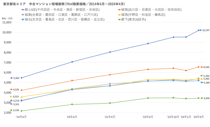 「不動産×WEB×ビッグデータ」の領域で、さまざまな不動産テックサービスを展開する株式会社ワンノブアカインド(本社:東京都港区、代表取締役社長:川島 直也、以下当社)は、当社が運営しているマンション情報サイト「マンションレビュー」の保有データを元に、全国の2024年4月の中古マンション相場を調査。坪単価をベースに70㎡での価格に換算した「中古マンション価格」*1について、10年前・5年前・3年前・前年からの推移を都道府県別・エリアごとにまとめましたので、発表いたします。