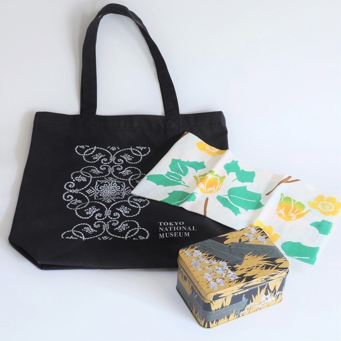 本館ラウンジのモザイク柄バッグとシンボルツリーの「ゆりの木」模様の手拭い、当館所蔵の名品をモチーフにした缶入りクッキーの詰合せです。