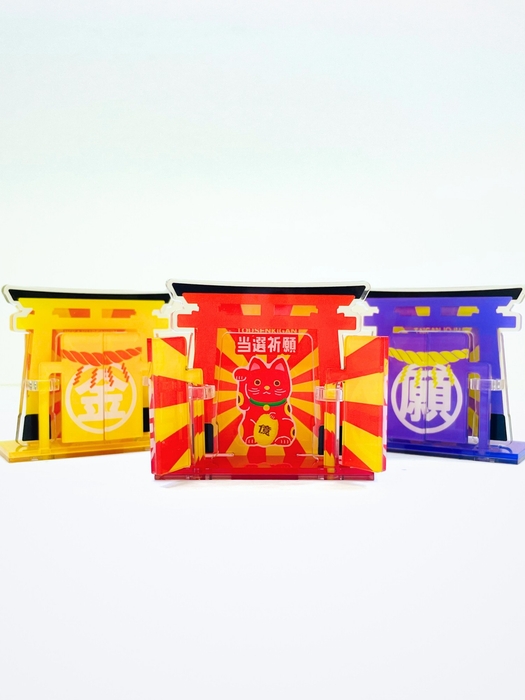 デザインは「当選祈願(赤)」「笑門来福(青)」「開運招福(緑)」「大願成就(紫)」「一攫千金(黄)」の5種類。お札やチケットなどもまつれます。