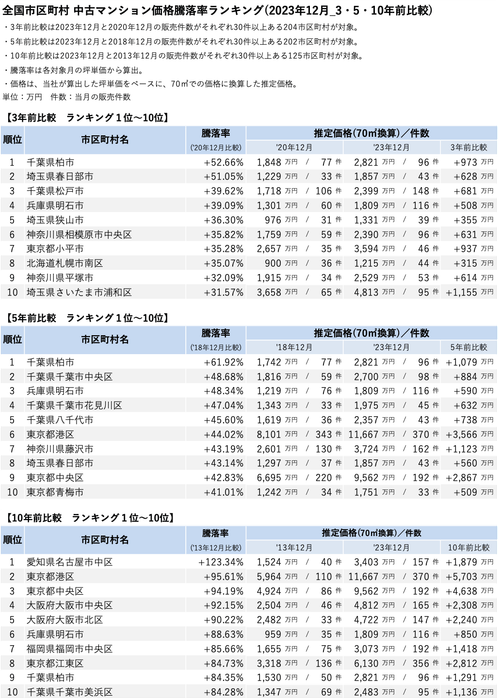 「不動産×WEB×ビッグデータ」の領域で、さまざまな不動産テックサービスを展開する株式会社ワンノブアカインド(本社:東京都港区、代表取締役社長:川島 直也、以下当社)は、当社が運営するマンション情報サイト「マンションレビュー」の保有データを元に、2023年12月の全国市区町村における中古マンションの相場を調査。坪単価をベースに70㎡での価格に換算した「中古マンション価格」*1と価格ランキング上位20件について過去10年間の価格推移、および1年前からの価格の上昇率を表す「騰落率」のランキングを発表いたします。