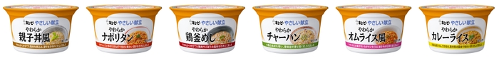 「やわらか親子丼風」「やわらかナポリタン」「やわらか鶏釜めし」「やわらかチャーハン」「やわらかオムライス風」「やわらかカレーライス」 計6品