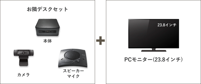 『お隣デスク』は、本社から離れた支社にいるメンバーの近くにPCモニター(24インチほど)を設置してリモートで常時接続する小規模向けとなっており、場所が離れていてもメンバーがまるで隣にいる状態となり、いつでもコミュニケーションを取り合う環境を構築することが可能です。