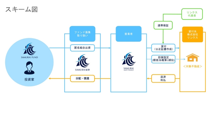 このファンドは営業者であるSAMURAI ASSET FINANCE株式会社(以下、「営業者」)が実施した、株式会社リンクス(以下、「貸付先」)への貸付事業から生ずる収益を出資者に分配するものです。本匿名組合では営業者が貸付先に対して実行した3億5000万円の貸付(以下、「本件貸付」)に対するバックファイナンスを行います。