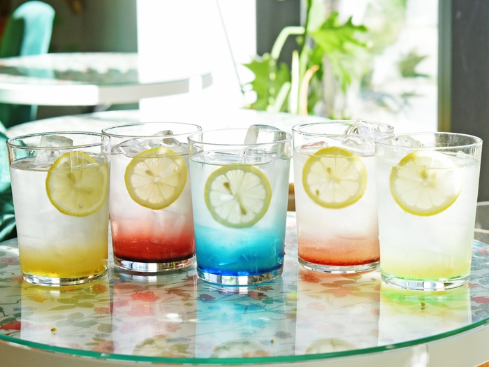 各国をイメージしたスペシャルレモネード。中央の国(パッションフルーツ)、北の国(ワイルドベリー)、東の国(ブルーキュラソー)、西の国(サングリア)、南の国(グリーンバナナ)の5種類からお好みを1つお選びください。バッグ入りのFLOWERSスペシャルミニブーケがセットで付いてきます。