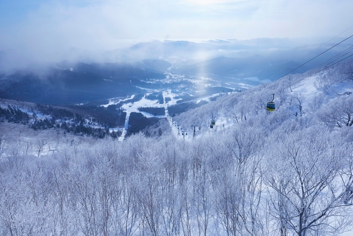 空気が澄んで晴れた日の青い空と霧氷に包まれた真っ白な雪山は、寒い地域ならではの絶景です。気温が低い朝には、空気中の水分が凍り太陽の光に照らされ、きらきらと輝くダイヤモンドダストが見られることもあり、より一層霧氷の絶景を堪能できます。この霧氷の発生確率は約58%(*1)とシーズンを通して高い確率で観賞することができます。