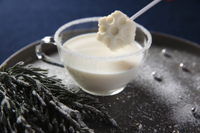 霧氷テラスでは、山々の木々に広がる霧氷の景色を表現したオリジナルの「霧氷カクテル」を提供します。これは、生クリームとブルボンバニラが入ったホワイトチョコレートリキュールに「トマム牛乳」(*2)を合わせたホットカクテルです。雪の結晶をモチーフにしたホワイトチョコレートを溶かして飲みます。とろけるような滑らかな口当たりと甘さが特徴です。また、霧氷テラスオリジナルスイーツの「霧氷ロールケーキ」を提供します。このロールケーキは、霧氷のついた雪景色をイメージしたスイーツです。飴細工やアラザン、ココナッツパウダーなどを使い霧氷のきらめきを表現しています。霧氷をモチーフにしたカクテルやスイーツを楽しみながら雪山の絶景を眺めるのがおすすめです。