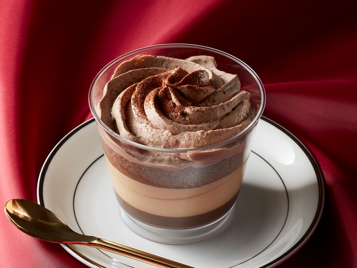 濃厚なチョコレートとキャラメルを組み合わせ、ビターで濃厚なカップケーキです。下から、チョコソース、ヘーゼルナッツキャラメルムース、ココアスポンジ、キャラメルカスタード、削りチョコ入りチョコホイップクリーム、トッピングにココアパウダー。様々な食感をお楽しみいただける、5層仕立ての贅沢なスイーツです。