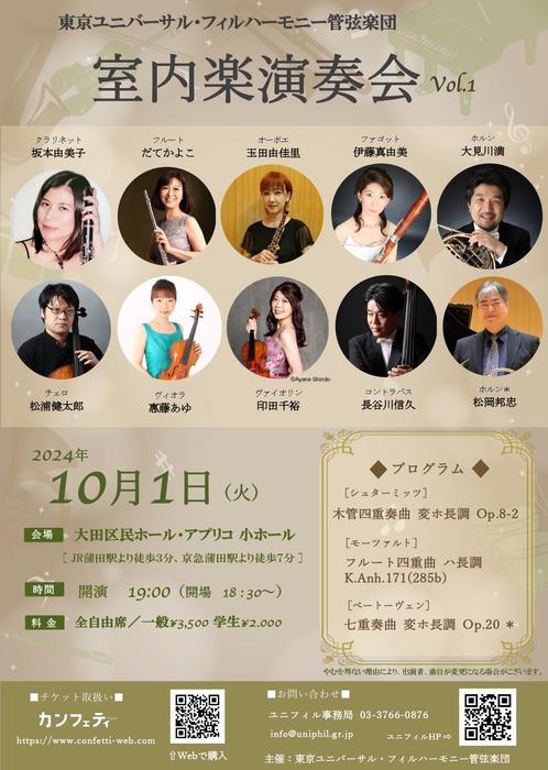 東京ユニバーサル・フィルハーモニー管弦楽団(代表:河村 隆三)主催、『第一回室内楽演奏会』が2024年10月1日 (火)に大田区民ホール・アプリコ(東京都 大田区 蒲田 5-37-3)にて開催されます。