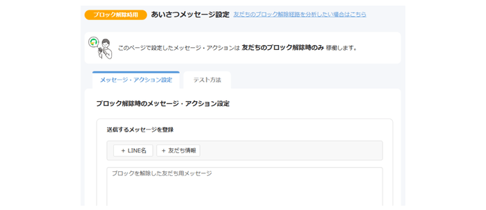 これにより、ユーザーがLINE公式アカウントのブロックを解除した瞬間に、あらかじめ設定したメッセージやアクションを自動送信できるようになり、再エンゲージメントをスムーズに行えます。