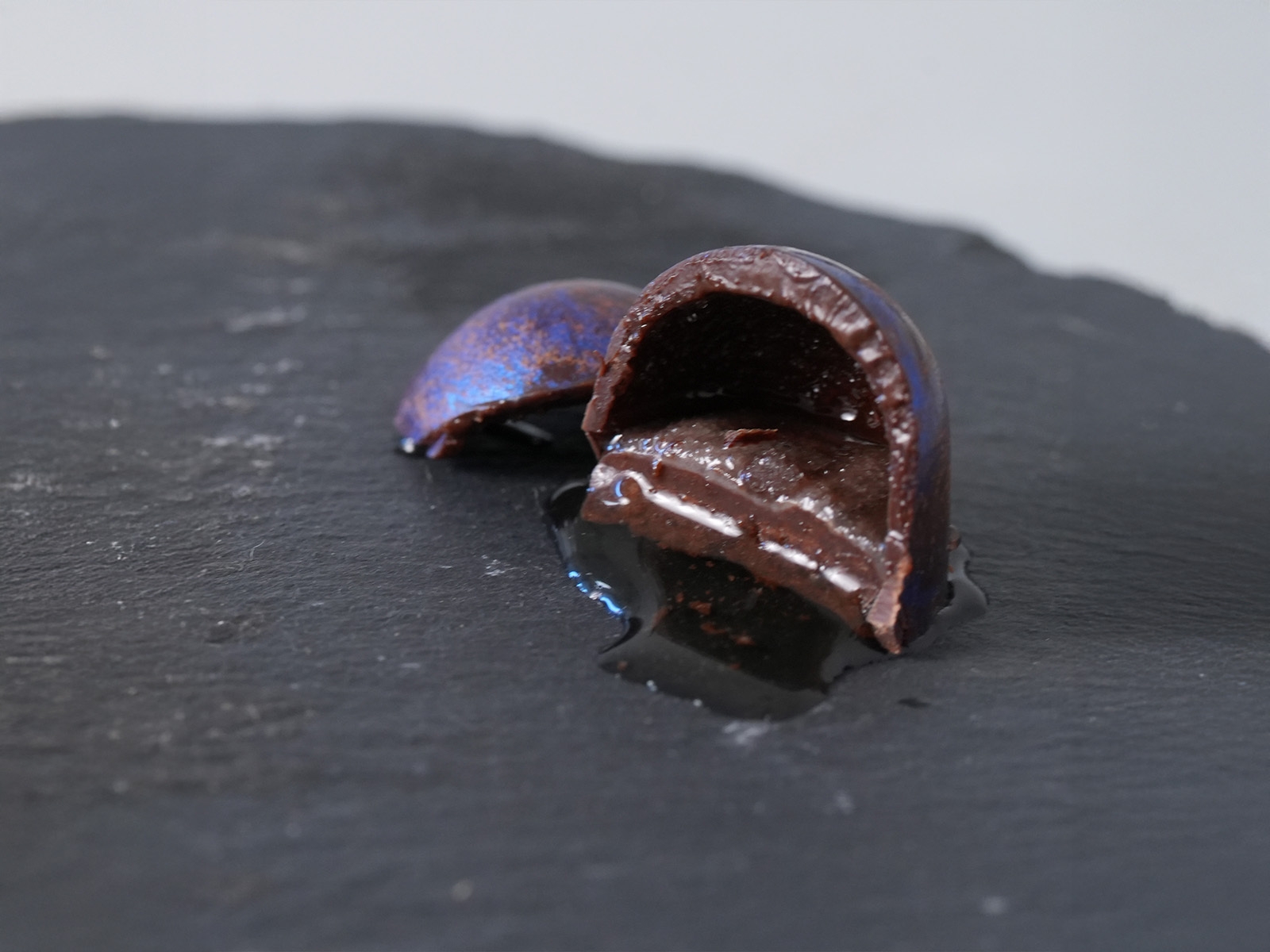テンパリングした薄いチョコでコーティング。パリッとした食感。口の中でお酒がほどよく弾けるよう、チョコレートの厚みや温度、包み方の細部にまでこだわりました。