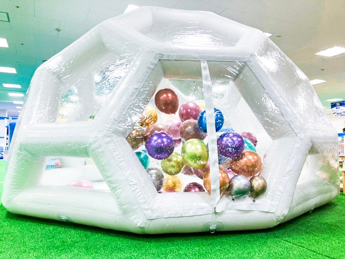 透明で大きなバルーンの中に入れるユニークな新遊具が登場。保護者様も入場可能の為、親子で一緒にお遊びいただけます。