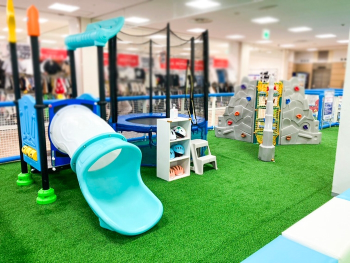 天候を気にせずアクティブに遊べる公園コーナーでは、お子様が大好きなブランコやすべり台、トランポリンなどの公園でお馴染みの遊具を室内でお楽しみいただけます。