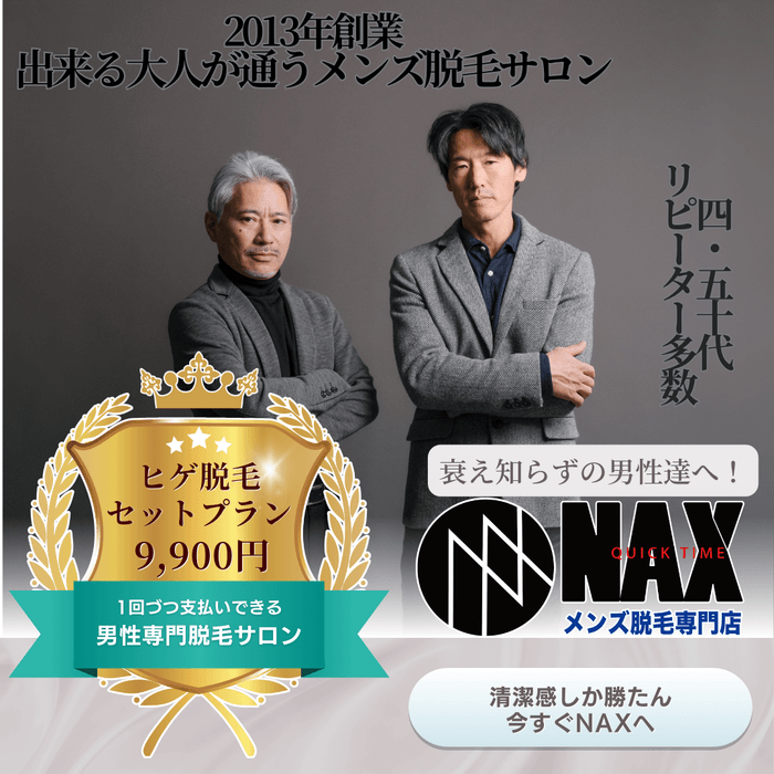 男性の身だしなみとして注目される「ひげ脱毛」。特に40代・50代の大人な男性の間で、メンズ脱毛NAXの「ひげ脱毛セットプラン」が大人気です。このプランは、首元、ほほ、あご、鼻下、口下、もみあげといった顔のパーツ全てを脱毛できて1回9,900円とお得!忙しい毎日の中でも手軽に通えるこのメニューが、なぜ支持されているのか、その魅力をご紹介します。
