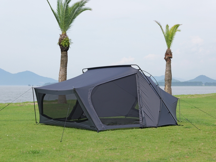 区画整備されたキャンプサイトや、シーズンで賑わうキャンプ場では縦横無尽に多くの人がテントの周りを行き交います。前後の高さを抑えることで視線を遮り、プライバシーを確保。また、メッシュを備えることで開放感のあるプライベートな居住空間を実現しました。