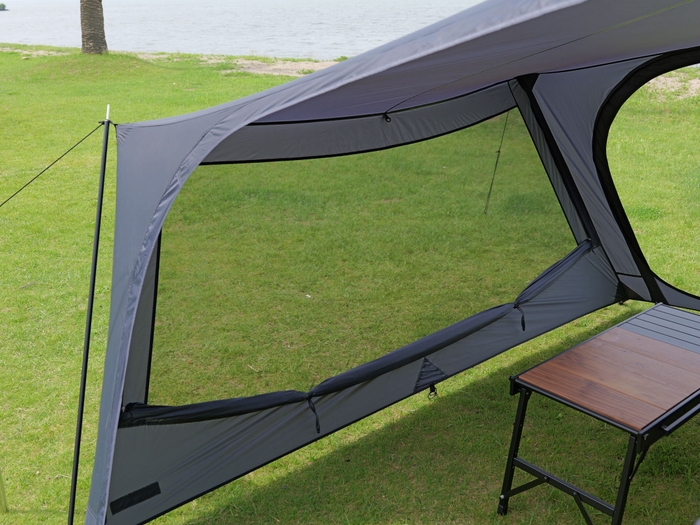 両側面出入り口のパネルは全て巻き上げ可能。前後はメッシュとして開放することで、テント内からは開放的なビューをお楽しみいただけます。