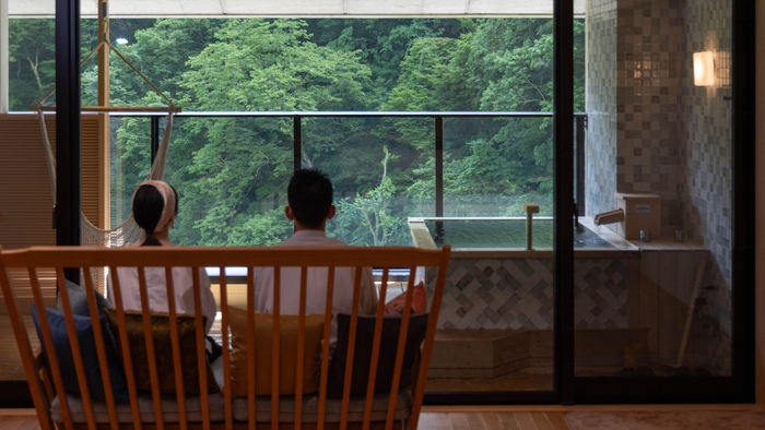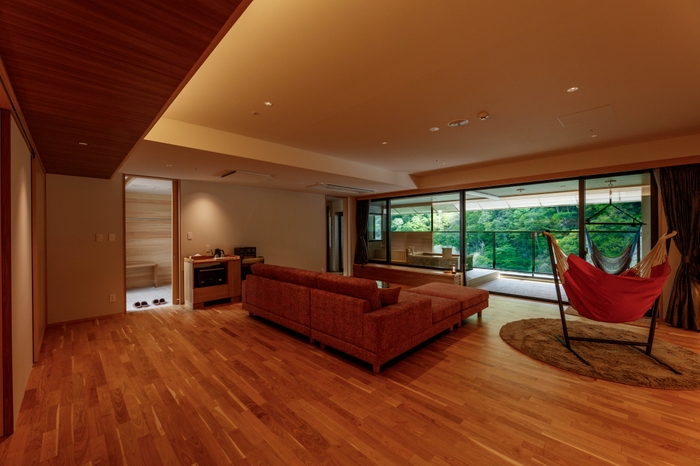 最上階7階の“里山Seyryu”サウナsuiteは限定3室。それぞれタイプが違う100㎡~のスイートルームは、プライベートで楽しめる源泉かけ流し露天風呂と里山の景色が見えるロウリュサウナ付き。サウナで汗をかいた後は、優しい風がそよぐハンモックテラスで贅沢な外気浴で“ととのう”滞在ができます。