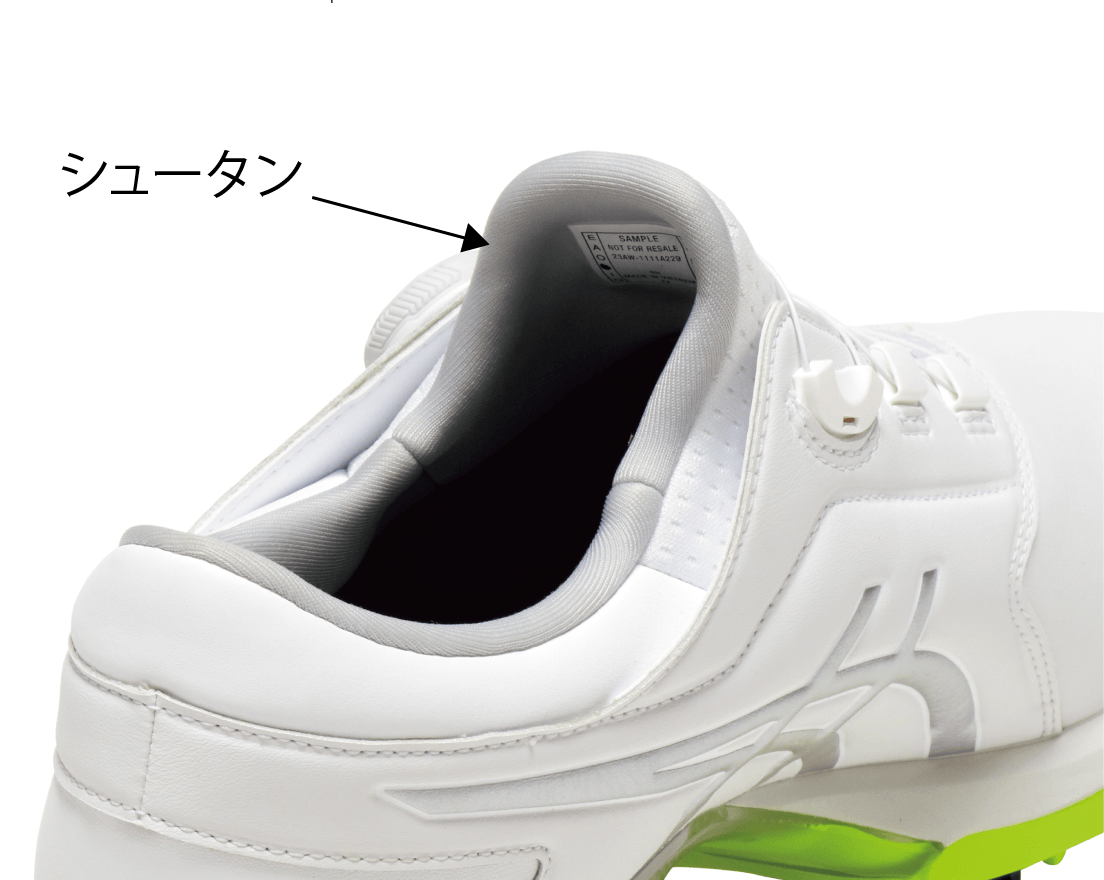 シュータンとアッパーが一体化されたモノソック構造がスイング時・歩行時のさまざまな場面でのフィット性を追求します。