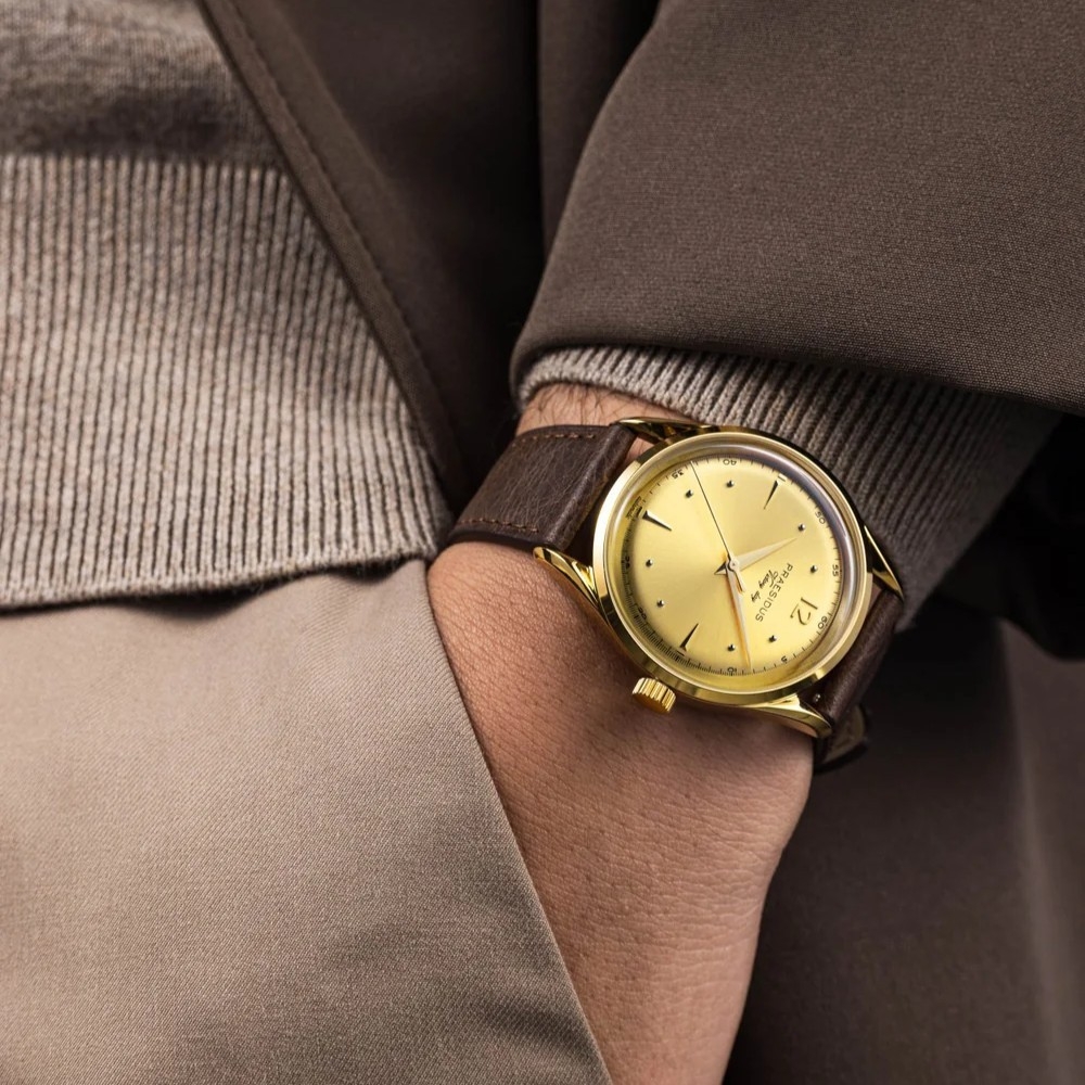 1945年9月2日、戦いの終結とともに訪れたのは、帰還・省察・そして再生の時でした。その歴史的な瞬間から着想を得て誕生した Victory Watch は、戦場の荒々しさを超えて、平和と繁栄の象徴としてのドレスウォッチを体現します。スリムな38mmのケースは、PVDゴールドコーティングを施したステンレススチール製。サファイアクリスタル風防を組み合わせ、普遍的なバランスと繊細なクラフツマンシップを表現しました。剣型の針、ファセット加工されたインデックス、ラッカー仕上げまたはブラッシュ仕上げの文字盤など、伝統的な時計づくりの美学を随所に感じられるデザインです。